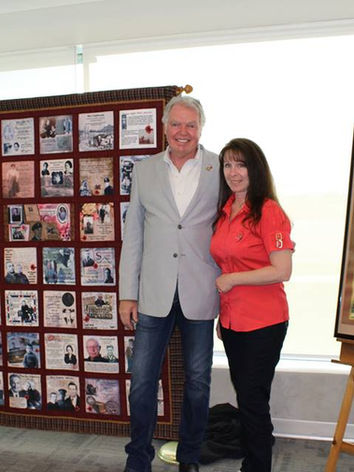 British Home Child George Beardshaw, 94 years old, 2017 showing off his square on the quilt.